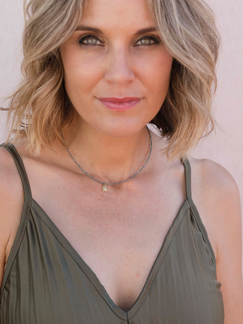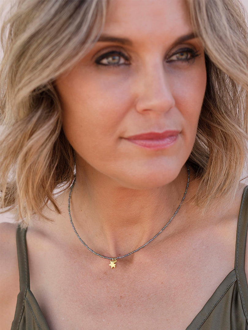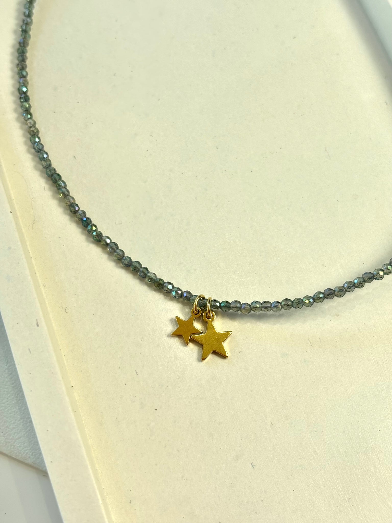Collar Casilda estrella con circonitas facetadas en tonos verdes claros de 2mm y en la parte central dos estrellas de diferentes tamaños fabricadas en acero inoxidable, con un largo de 38cm y extensión de 5cm para poder poner a diferentes alturas.