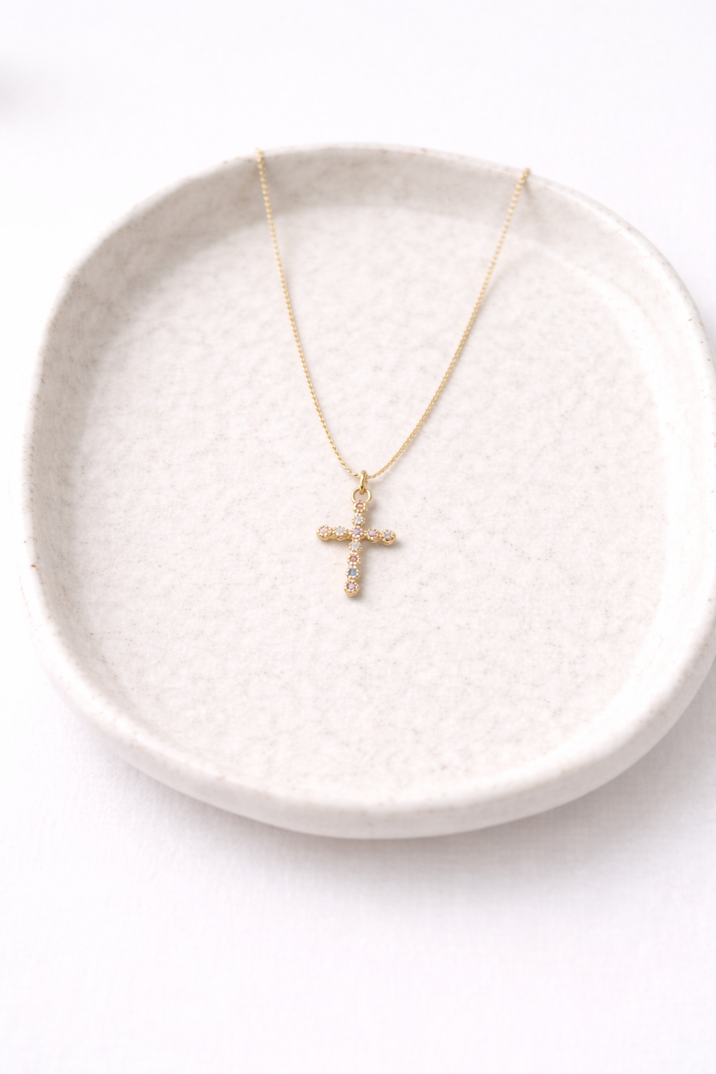 Collar Atenea, cruz de acero inoxidable y circonitas con una medida de 1,5x 1cm chapada en oro, cadena de 0,6 y 37 cm de largo con extensión.