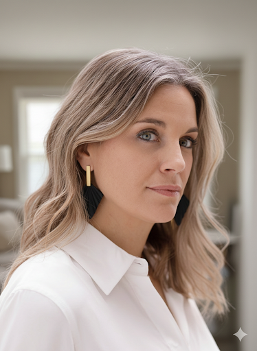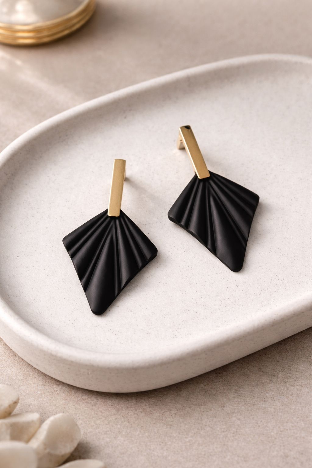 Pendientes Petra, con un diseño contemporáneo que combina líneas geométricas y elegancia atemporal. formados por una barra rectangular en acabado dorado mate que aporta mucha luz, unida a una pieza inferior en negro profundo con forma de abanico texturizado creando un contraste moderno y muy favorecedor.